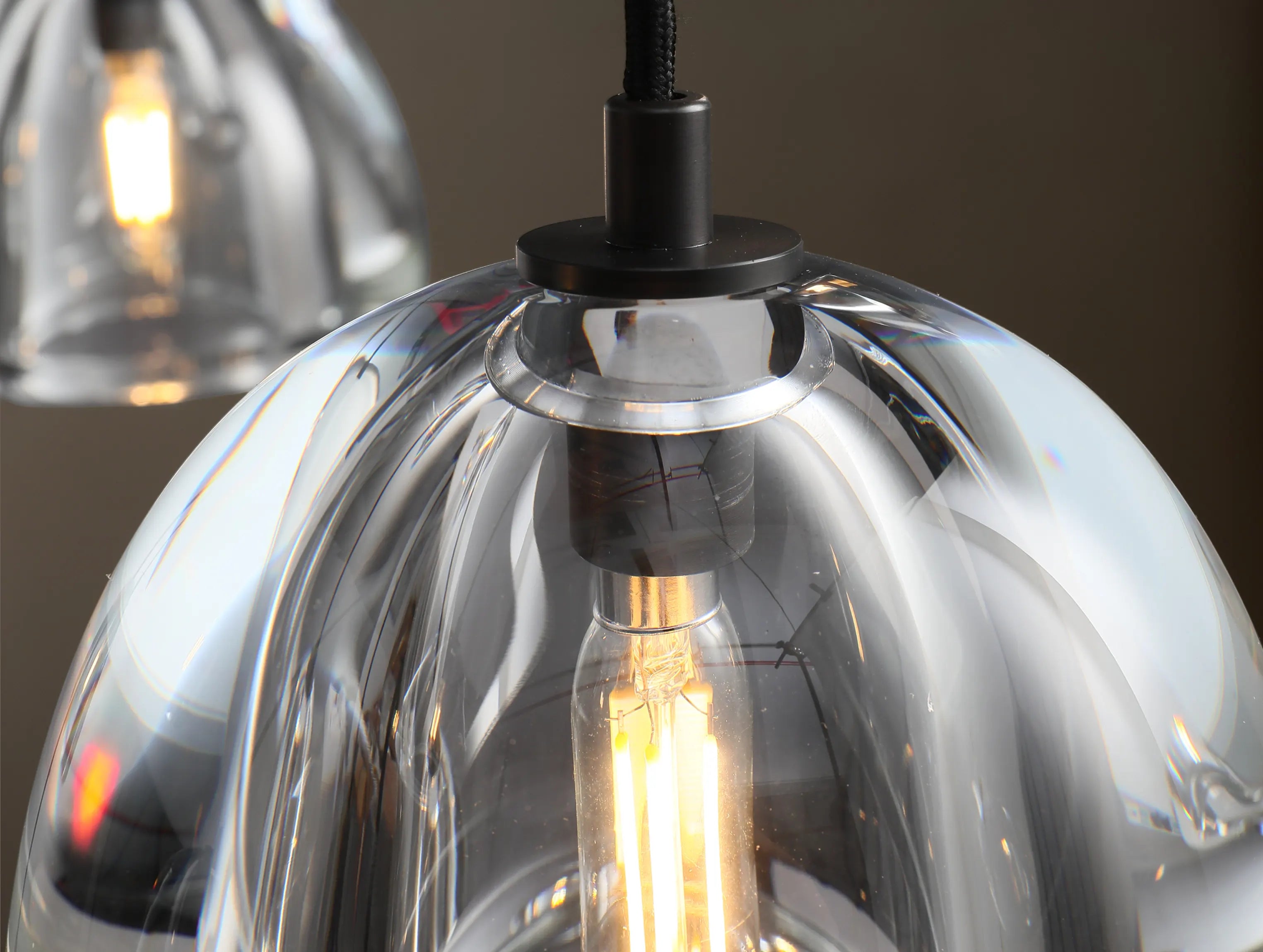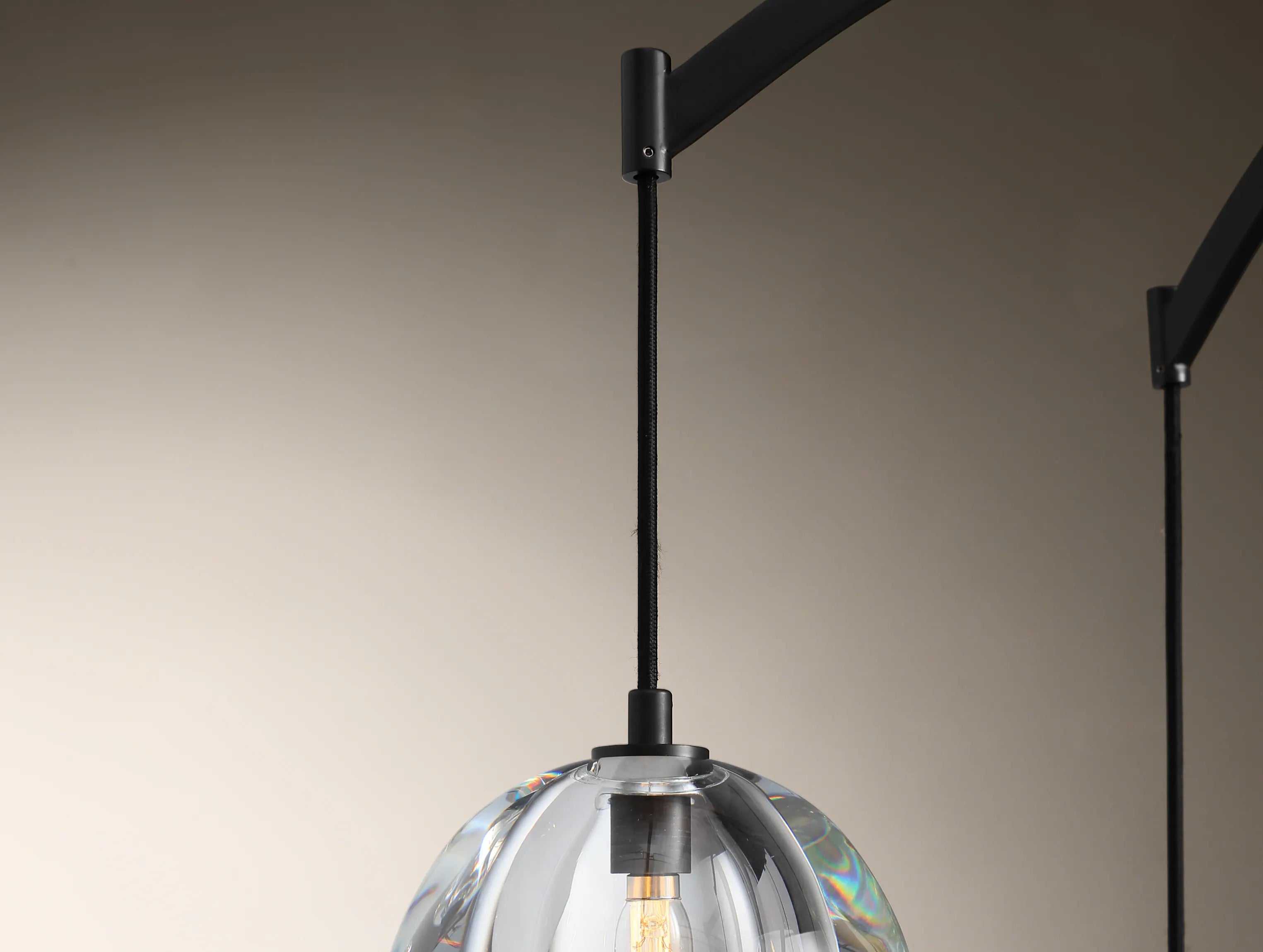 This crystal chandelier features weighty, dome-shaped shades carved from solid blocks of crystal, lathe-shaped and hand-polished over several days to achieve exceptional clarity and luster. Suspended from a handcrafted brass frame, the sculptural glass forms contrast elegantly with the refined arc of the structure, creating a bold yet balanced presence suited for grand dining rooms, entryways, and architectural interiors.