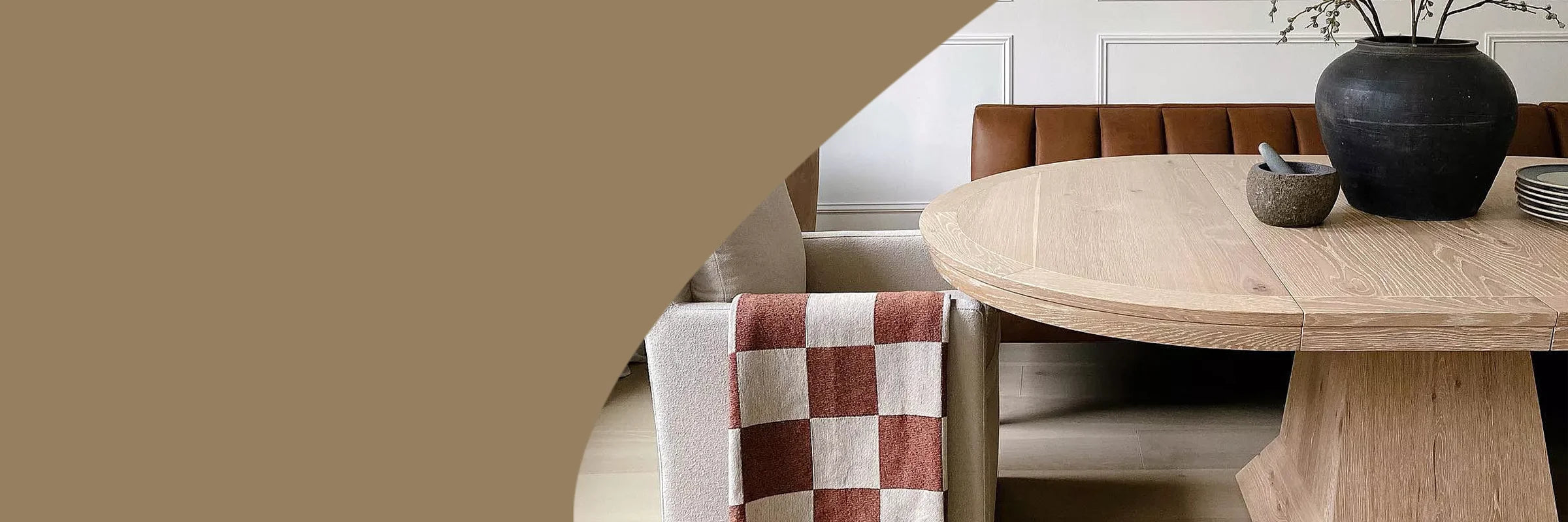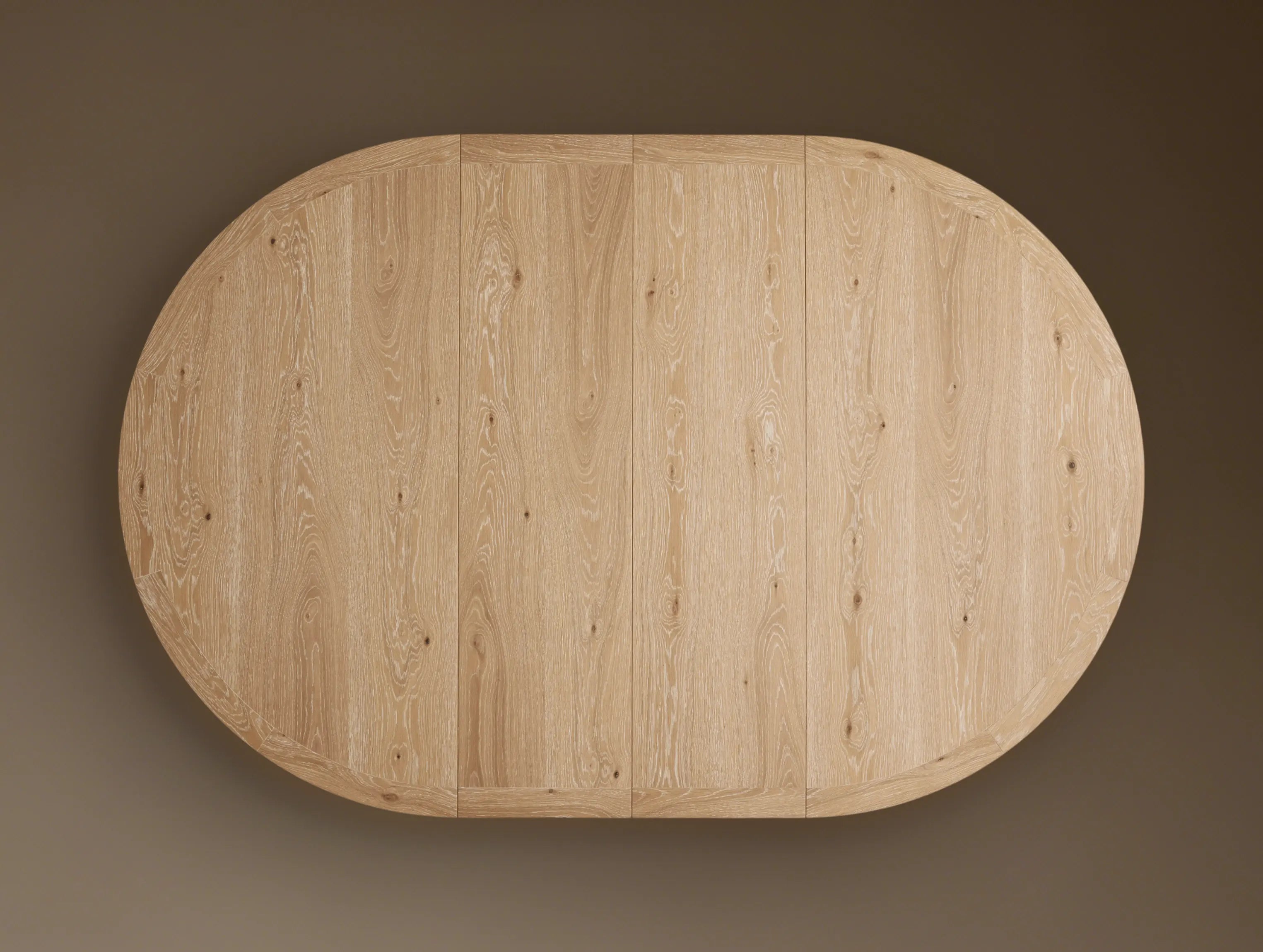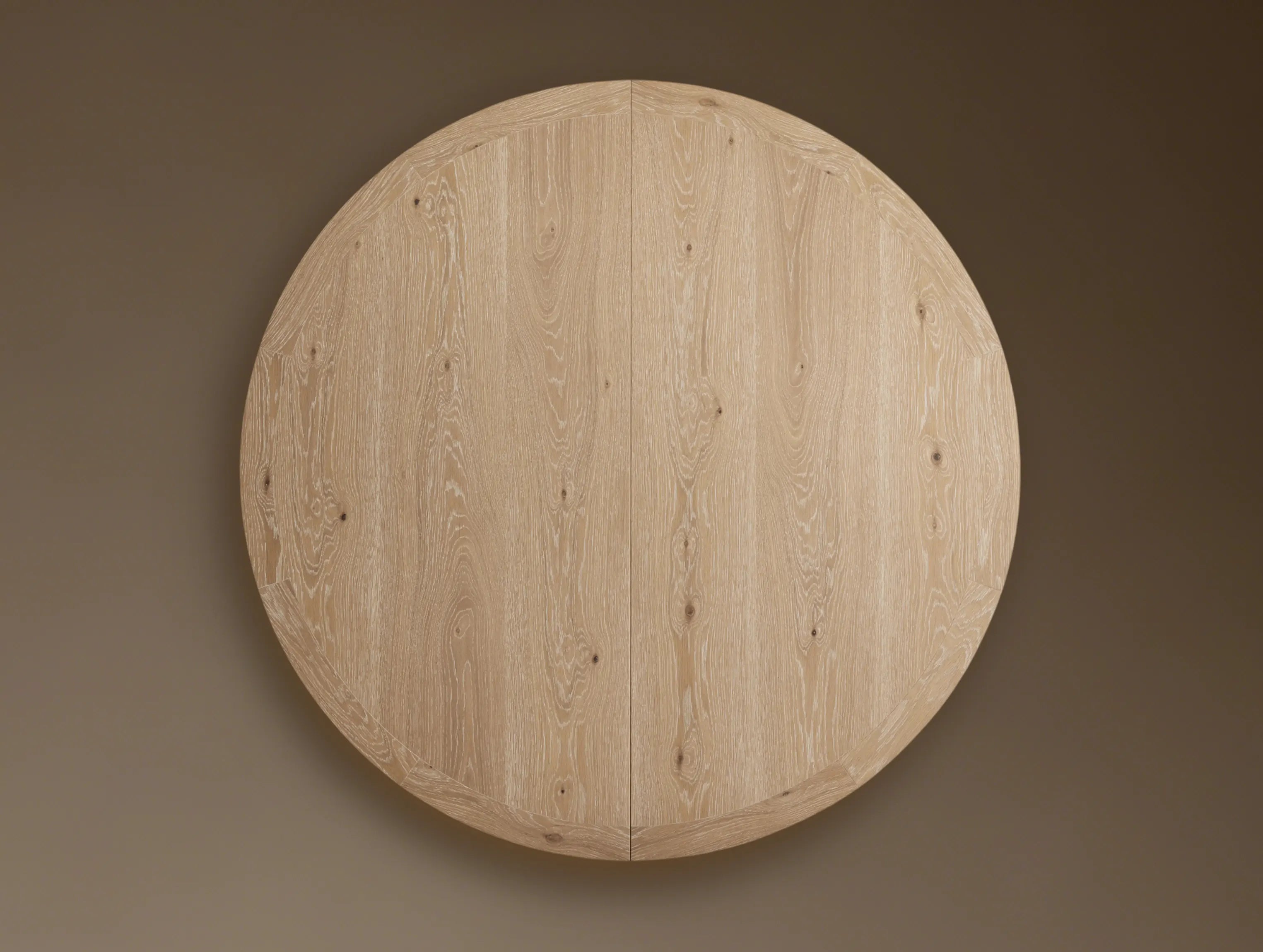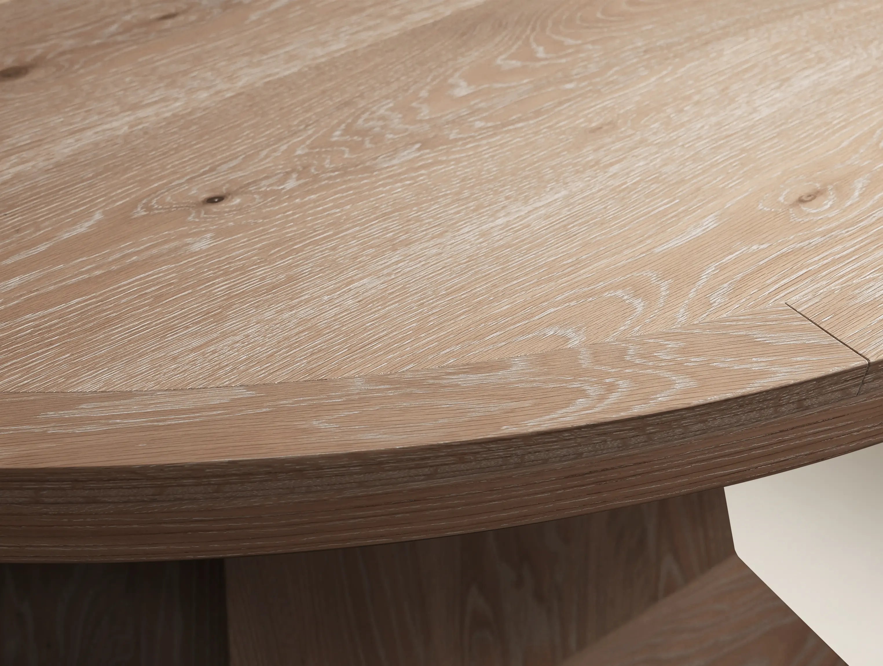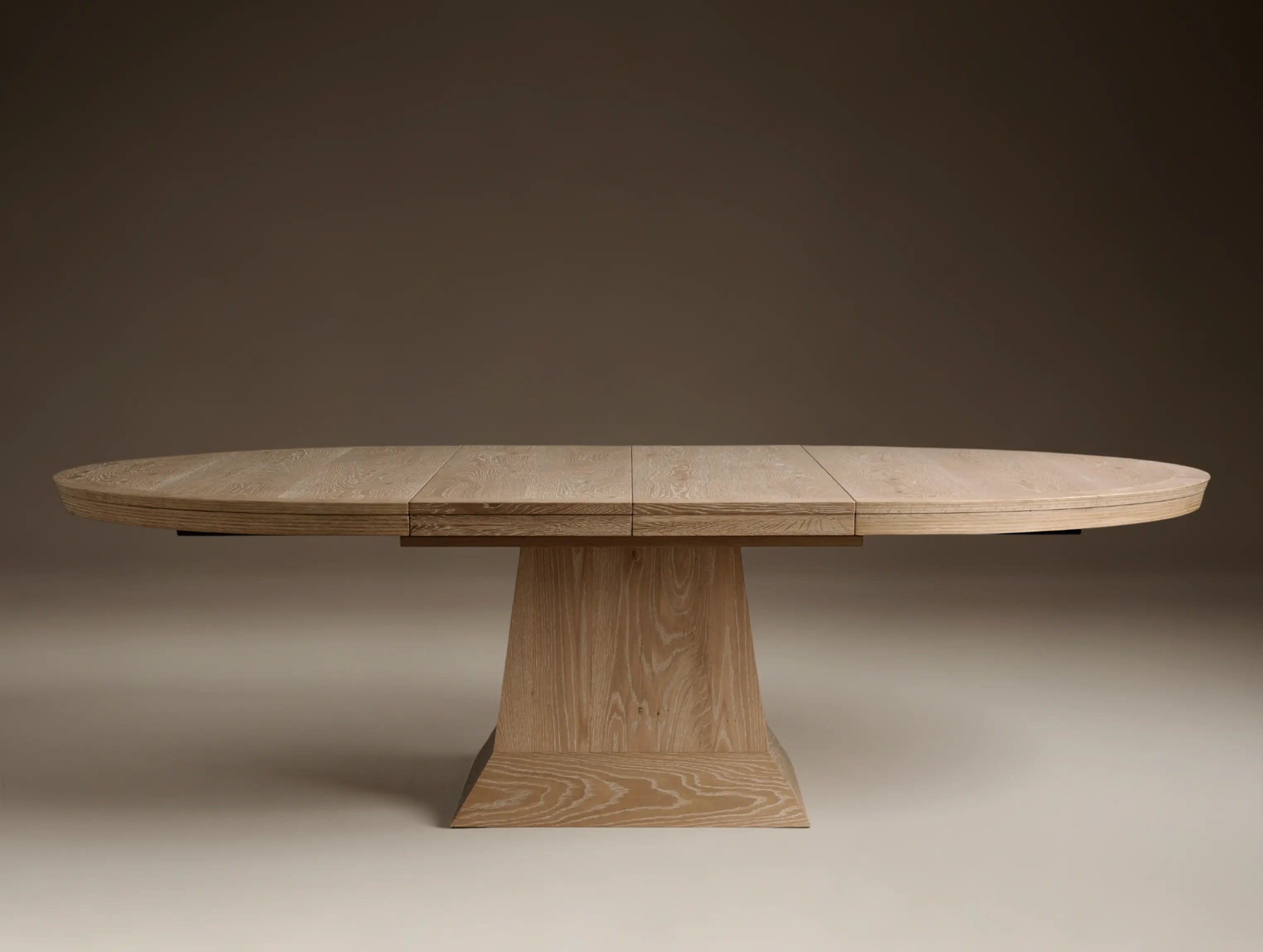 Handcrafted oak dining table with a transitional pedestal design and artisanal hand-finished details. The included extension leaves use a smooth rack-and-pinion system to expand the table for extra seating. Natural wood grain, subtle distressing, and protective lacquer make each piece unique.