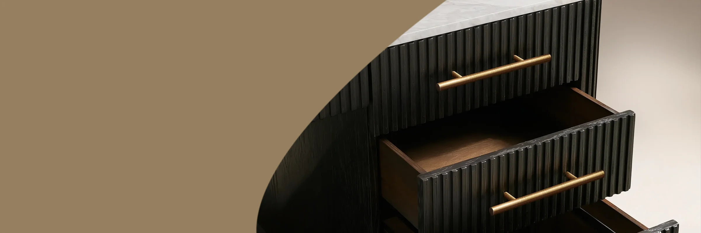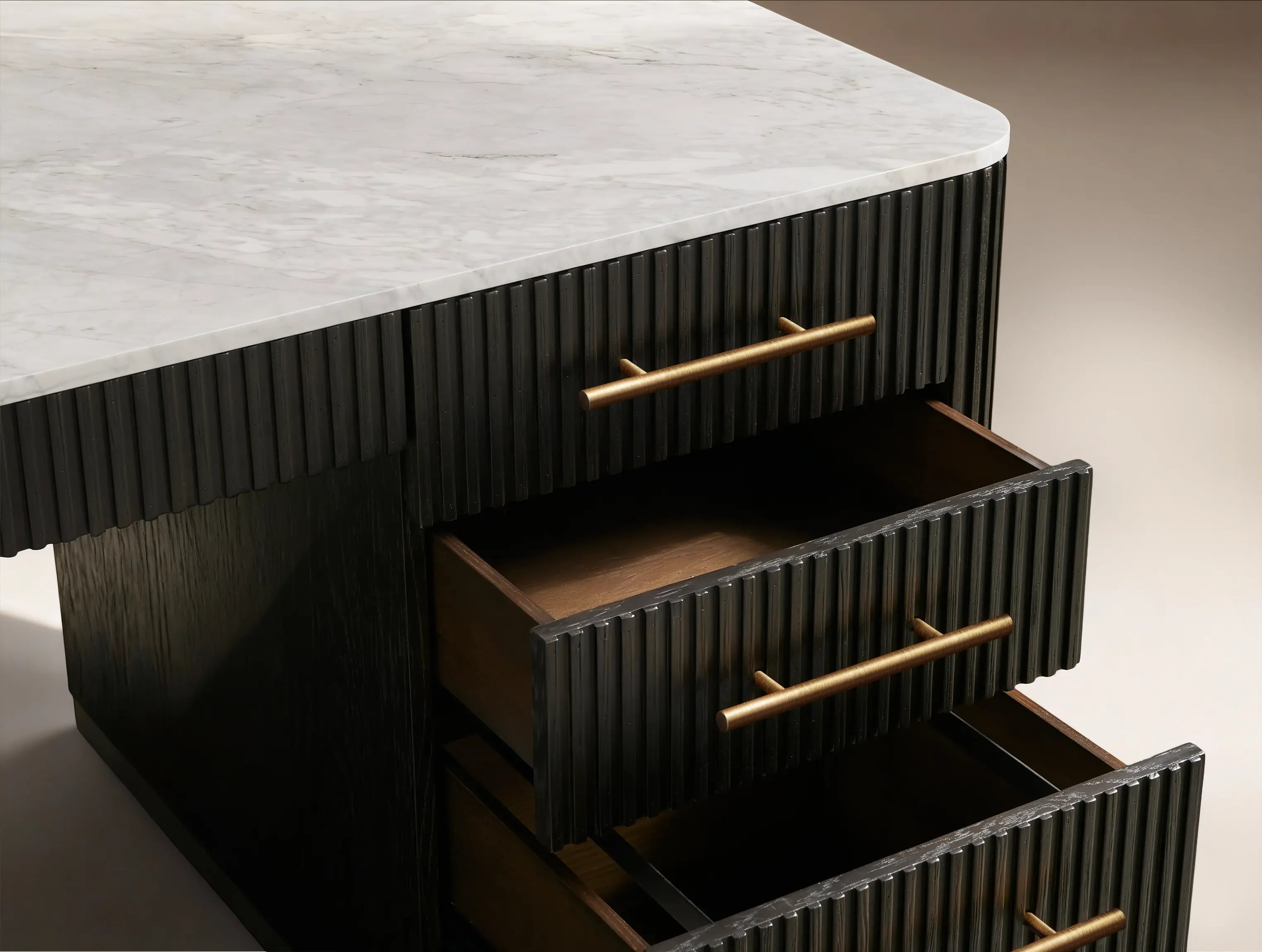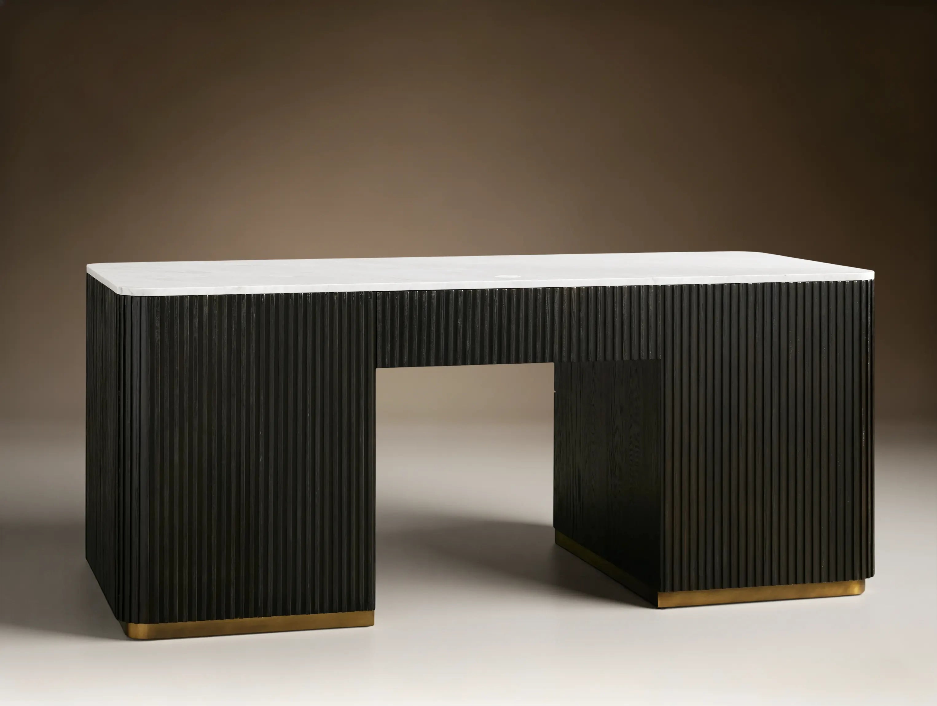 Blending rich materials and thoughtful craftsmanship, this executive desk brings elevated character to any workspace. Hand-finished wood pairs with stone surfaces, brass hardware, and reeded detailing to create a refined, modern statement. Built with reinforced joinery for long-lasting stability, it includes file drawers, a cord-management opening, and adjustable levelers to ensure the desk sits evenly on any floor.