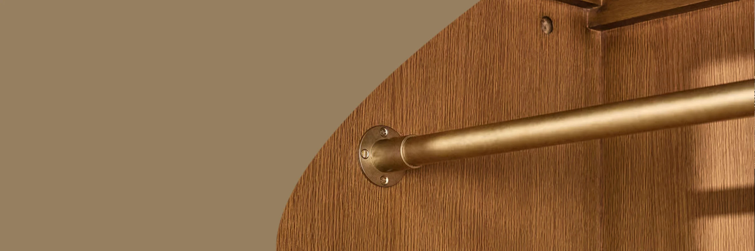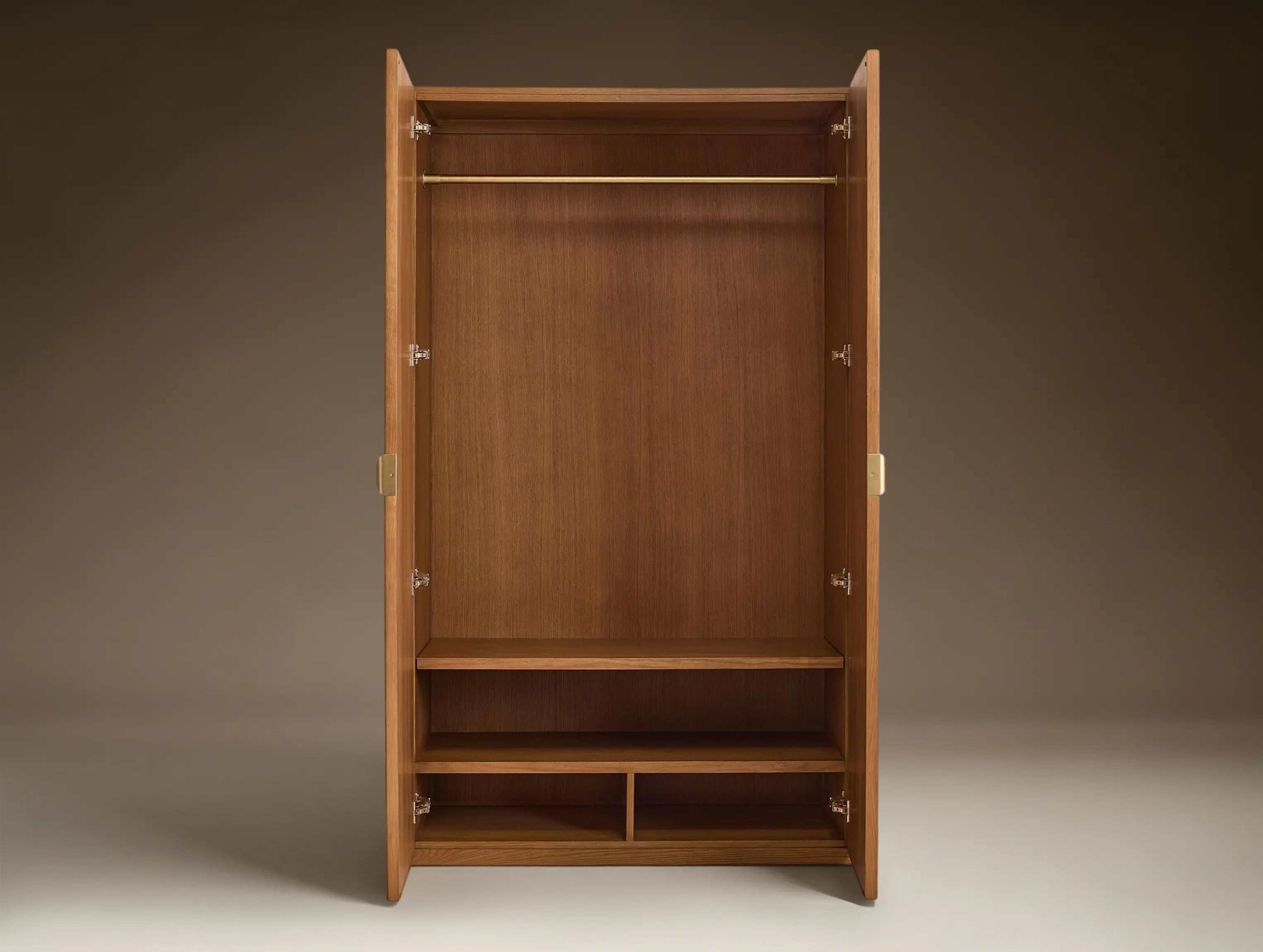 Inspired by Soho House Rome, this double wardrobe is crafted from oak with rigid carved detailing and antique brass-finished handles. Inside, it features a fixed bottom shelf, a removable shelf, and a hanging rail for versatile storage. Levelers on the feet ensure stability on uneven floors, combining timeless style with practical functionality.