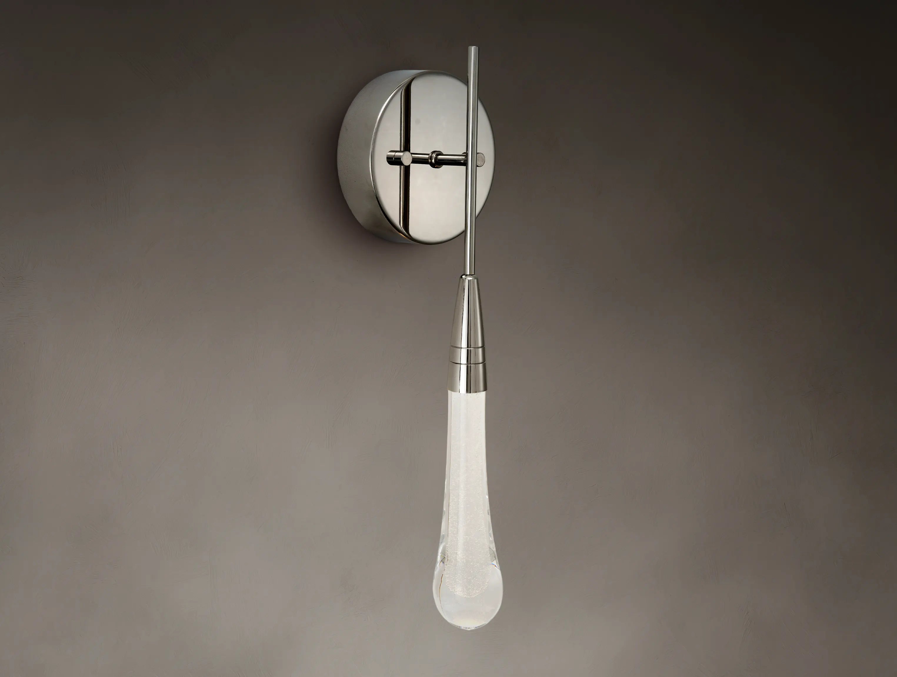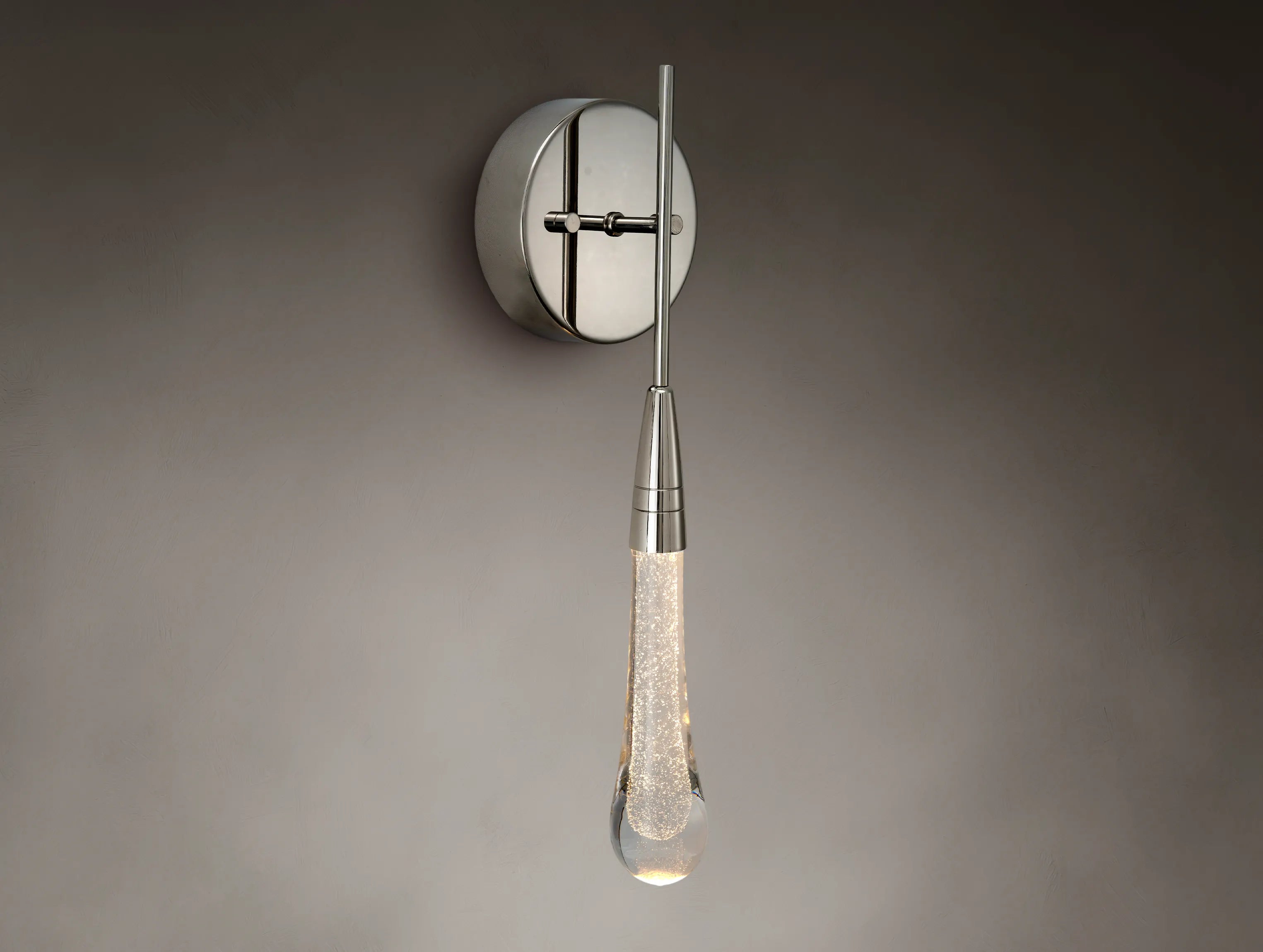 This wall sconce pairs a slender metal arm with an integrated LED light encased in hand-seeded glass, evoking the quiet elegance of a falling raindrop. The gently textured glass softens the glow while the streamlined metal form keeps the design light and contemporary, making it an understated accent for hallways, bathrooms, or bedside settings.