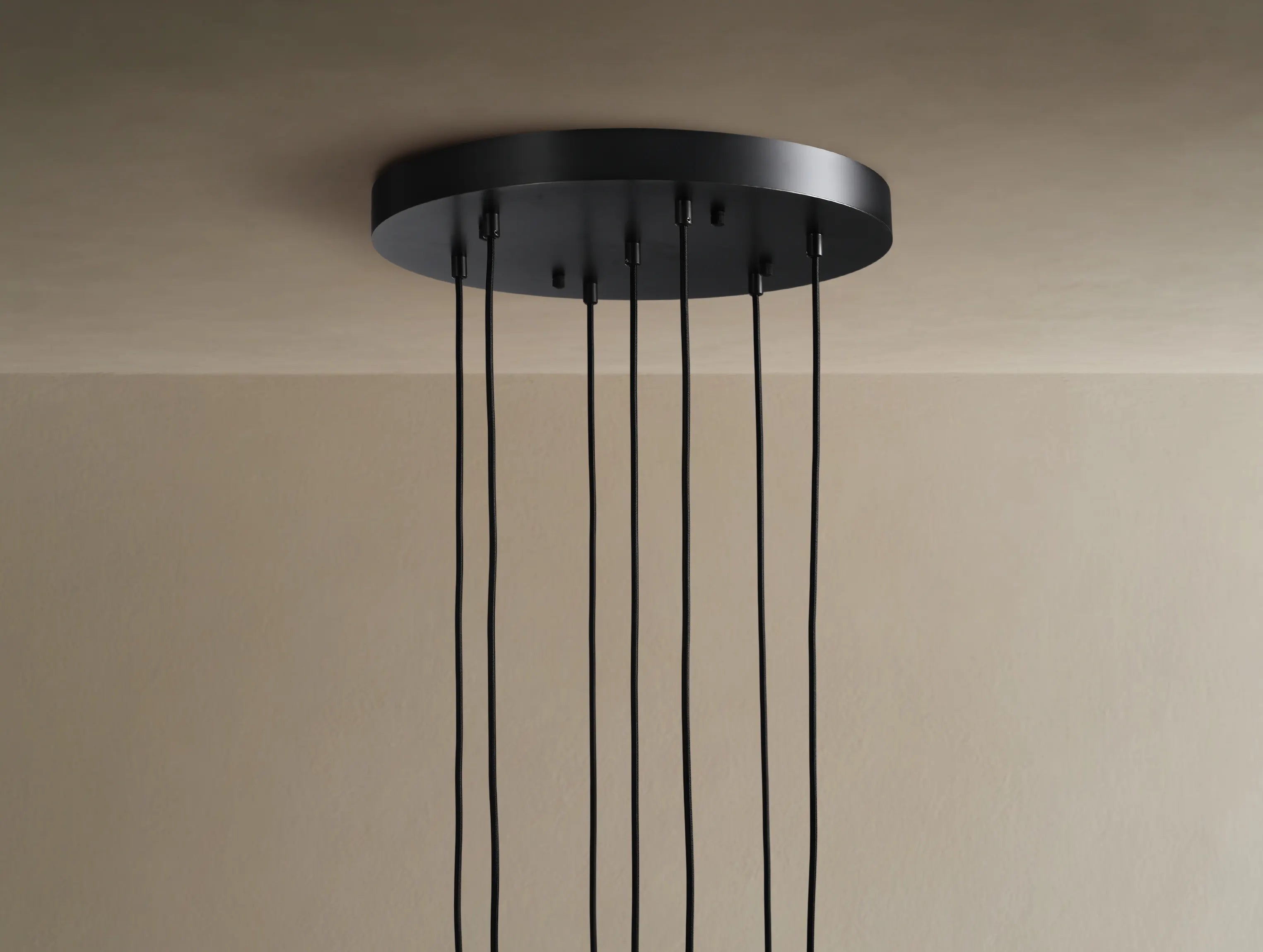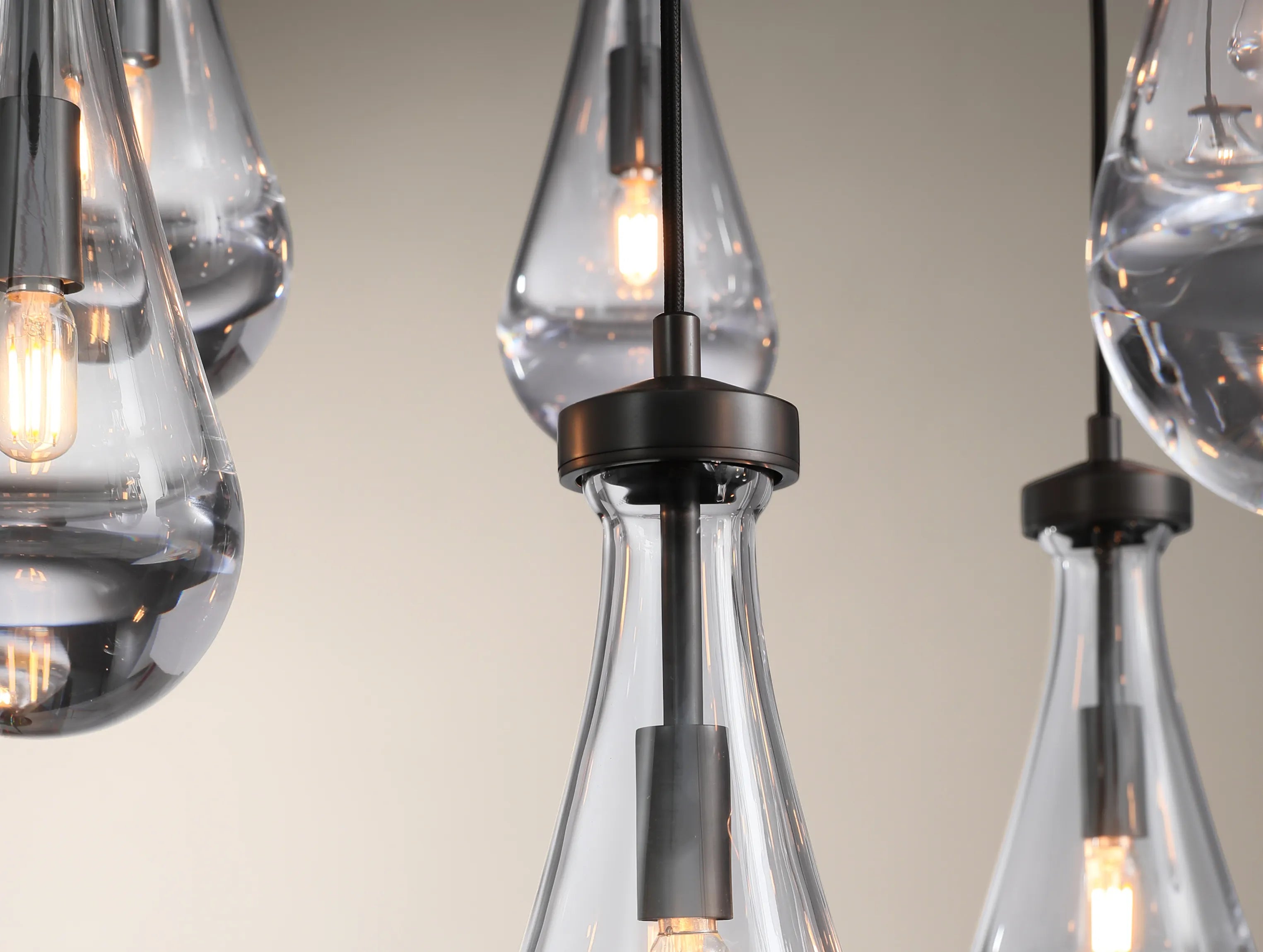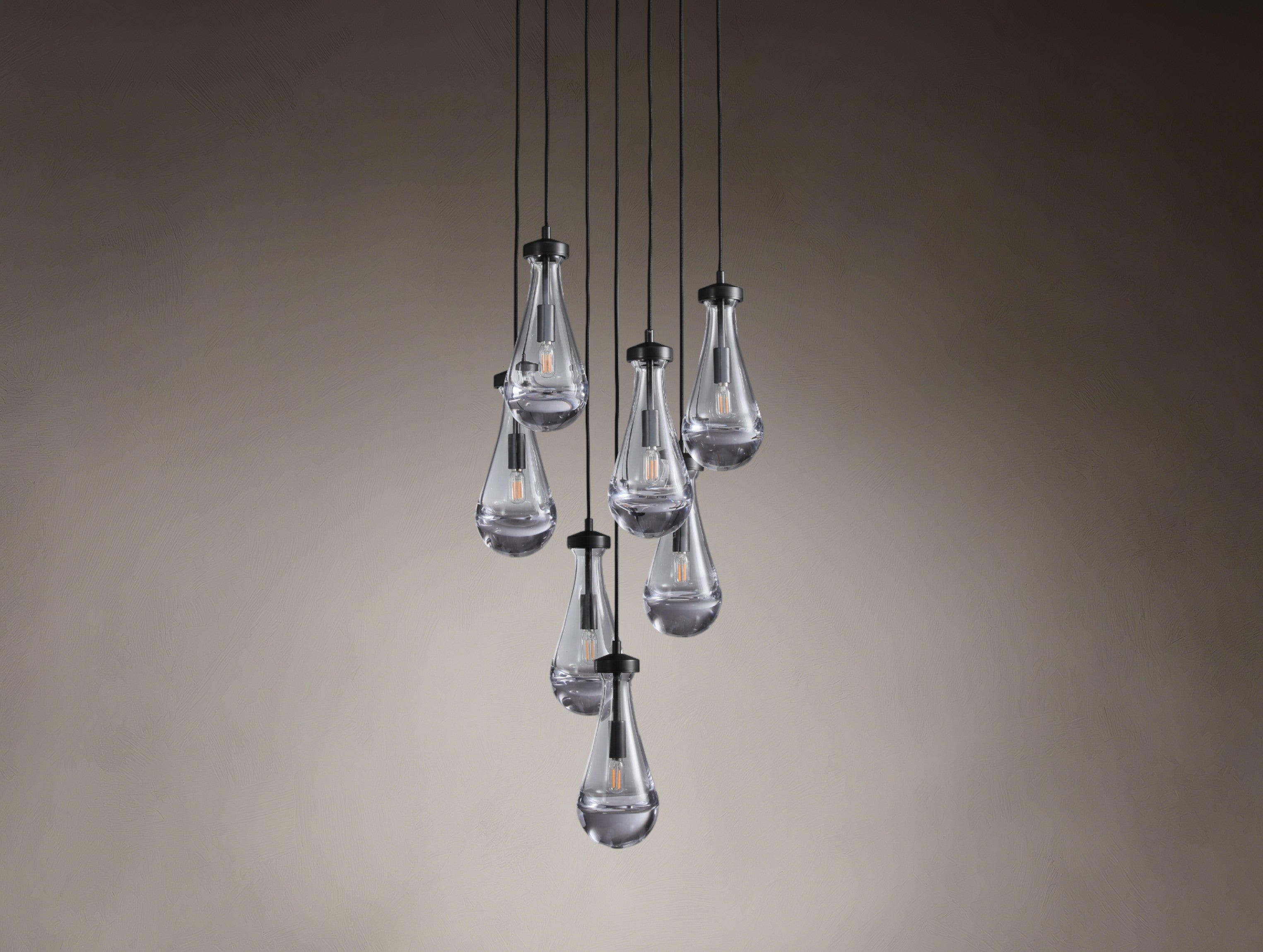 This chandelier features hand-blown glass drops suspended from slim black cords, creating a layered composition that scatters light in soft, rippling patterns across ceilings and walls. The weighty glass forms bring depth and movement, while refined brass fittings provide a quiet structural contrast, resulting in a dramatic yet restrained statement suited for large-scale interior spaces.